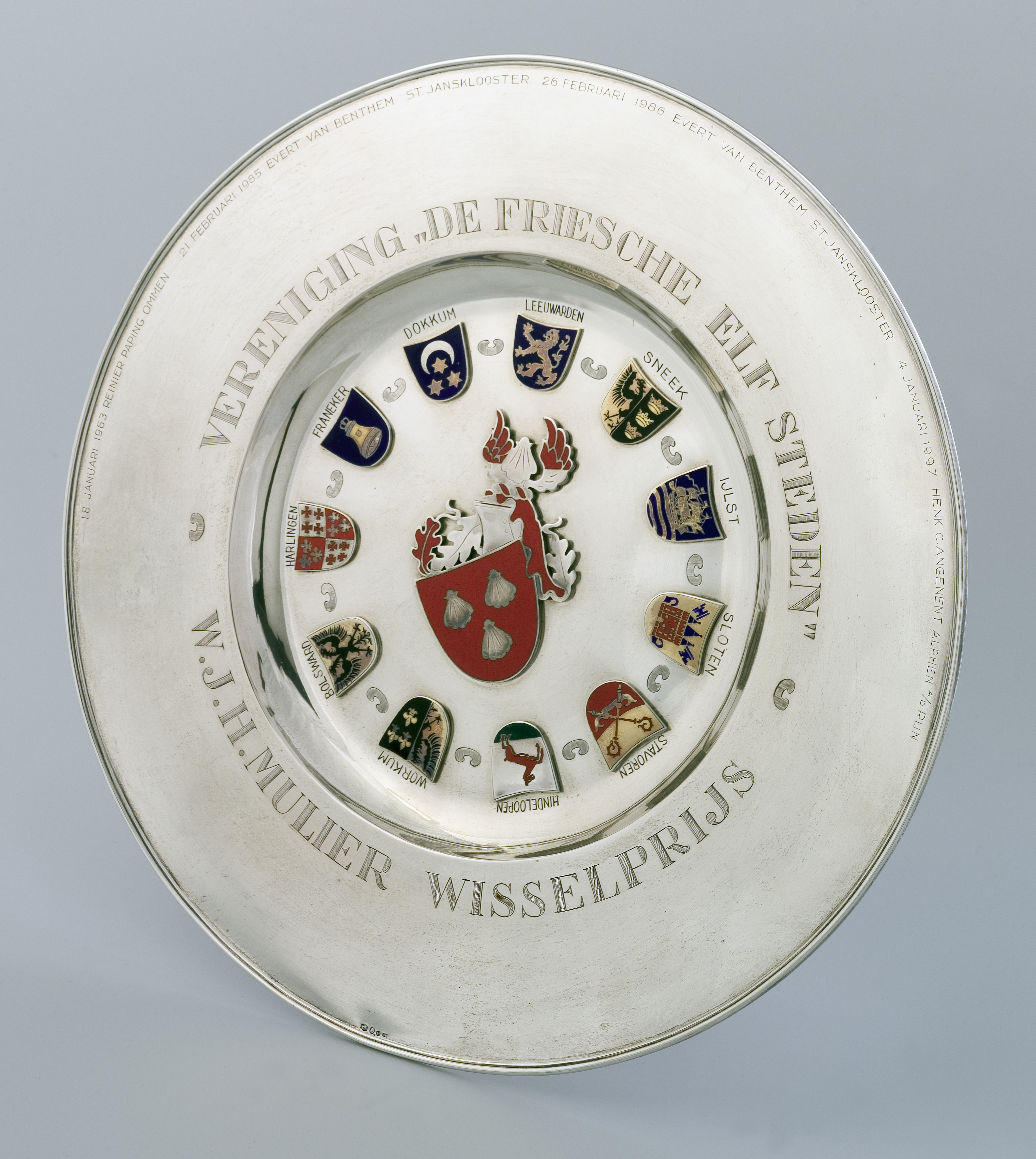 Het fraaie bord werd ontworpen door de Leeuwarder zilversmid J.A. van Houten. Hij plaatste het Mulier - familiewapen met drie schelpen op een rode achtergrond in het hart en daarom heen de wapens van de elf steden die allemaal met hun Hollandse naam werden vermeld.