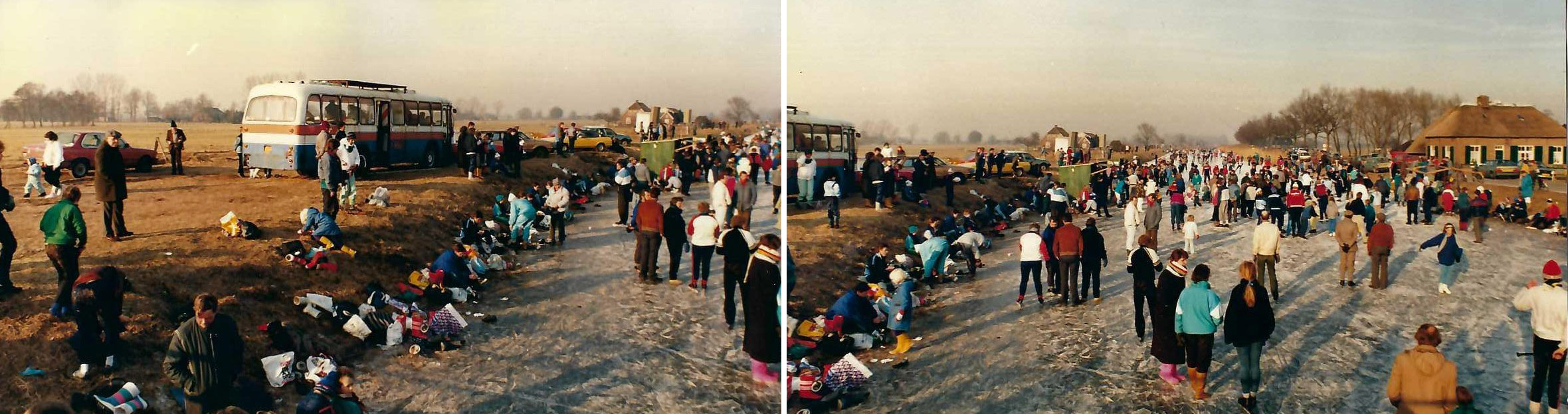 'Zaterdag 15 januari 1966. Op de foto zien we schaatsers naar de Papegaaibrug over het Apeldoornse Kanaal lopen om de eerste toertocht van Beemte te rijden. Op de achtergrond schaatsen al deelnemers op het kanaal. Op de voorgrond vindt net de opening plaats van het nieuwe bezinestation van Willerm en Truus Schimmel. Die opening stond al maanden vast, het doorgaan van de toertocht werd pas op vrijdag 14 januari definitief besloten. En zo zetten twee noviteiten op hetzelfde moment Beemte even op de kaart.'