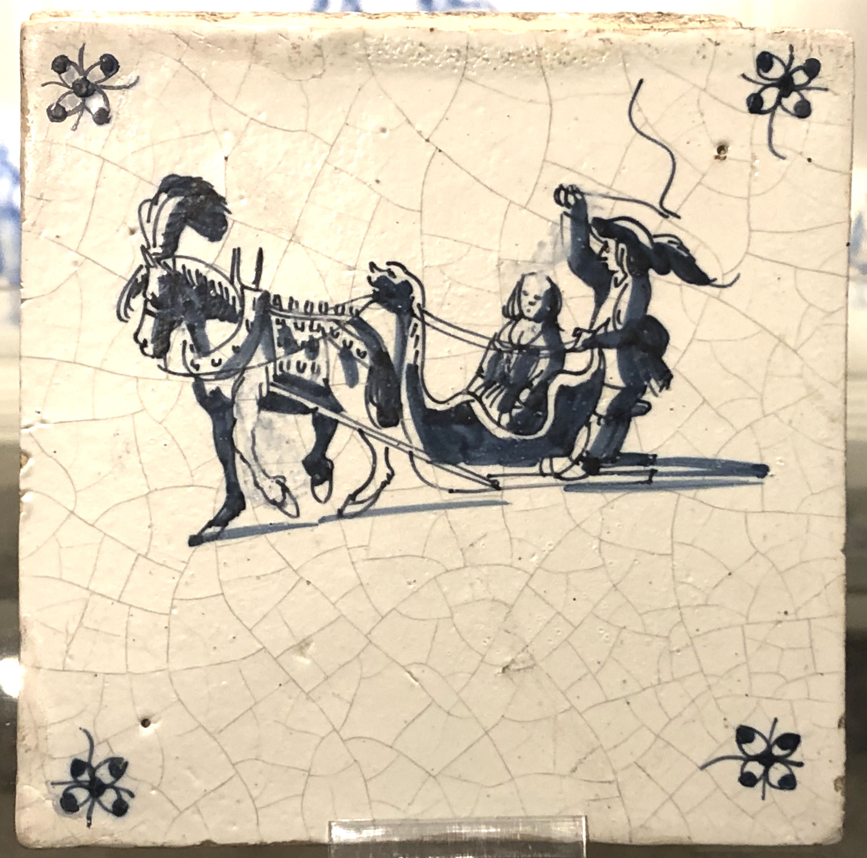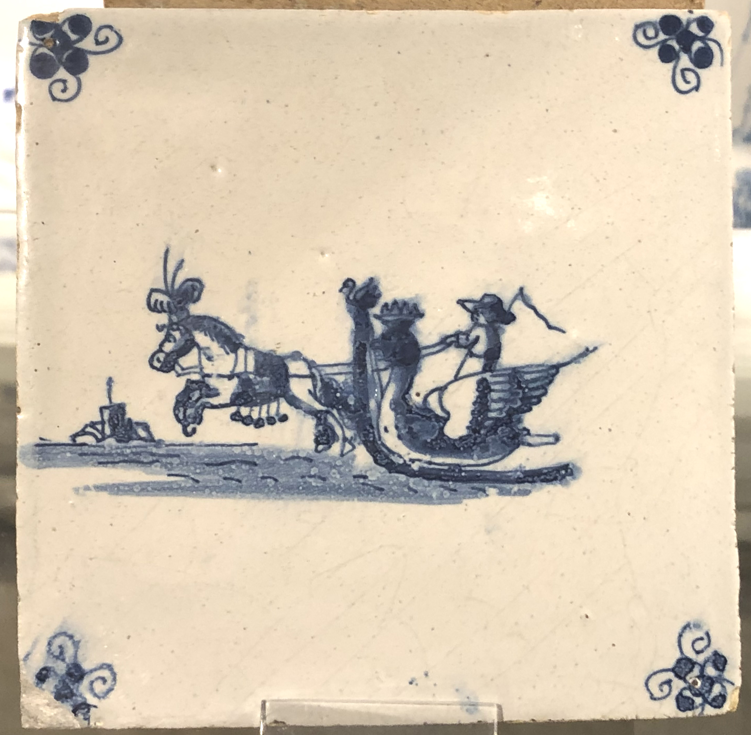 Dit enthousiasme verleidde mij tot een wel erg lang uitgevallen inleiding bij dit artikeltje dat over arrensleden op tegels gaat. Natuurlijk zijn ook op tegels arrensleden afgebeeld, hoewel niet zo vaak als je misschien zou verwachten. De tegels die afgebeeld zijn illustreren duidelijk hoe het paard uitgedost is. De boer en zijn vrouw zijn minder representatief geschilderd. Ik kan mij tenminste niet voorstellen dat de Friese boer zoals afgebeeld op de ene tegel in die tijd (het betreft een tegel uit de tweede helft van de 17e eeuw) een hoofdeksel met een grote pluim droeg, terwijl de boerin blootshoofds is afgebeeld. De vrouw zit overigens in de slee, terwijl tegenwoordig de dames niet in de te nauwe slee plaatsnemen, maar op de glijders naast het bankje staan.