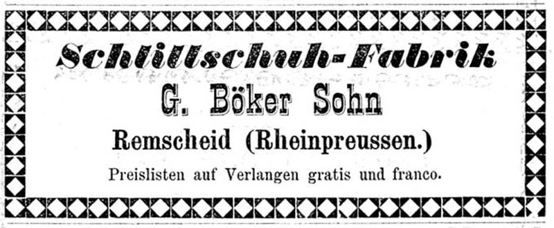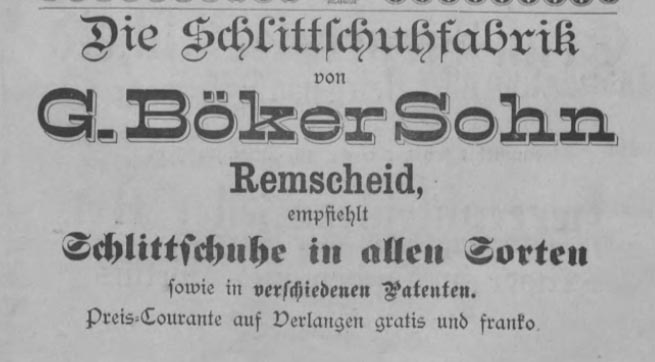 In de adresboeken van Remscheid 1884-1889 staat firma met de naam G. Böcker&Sohn vermeld. In de adresboeken daarna is de C in de naam verwijderd en is de firmanaam G.Böker&Sohn.